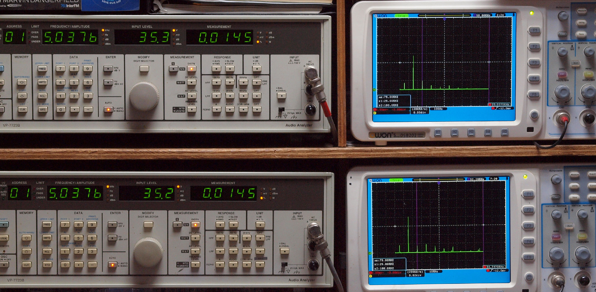 | E. 調整・測定。 画像をクリックすると、大きく(横幅2050ドット)表示されます。 E1. 出力・歪み率測定・調整。 「見方」。 上段中 右側SP出力を「Audio Analyzer Panasonic VP−7723B」により測定。 表示LED、 左端=メモリーNo、 中左=周波数測定、 中右=出力電圧測定、 右端=歪み率測定。 上段右端 VP−7723Bの基本波除去出力を「owon SDS8202(200MHZ)」で「FFT分析」表示。 下段中 左側SP出力を「Audio Analyzer Panasonic VP−7723B」により測定。 表示LED、 左端=メモリーNo、 中左=周波数測定、 中右=出力電圧測定、 右端=歪み率測定。 下段右端 VP−7723Bの基本波除去出力を「owon SDS6062(200MHZ)」で「FFT分析」表示。 下段左端 オーディオ発振器 VP−7201A より50Hz〜100kHzの信号を出し(歪み率=約0.003%)、ATT+分配器を通し、AMPに入力。 よって、ダイアル設定出力レベルより低くなります。測定機器の仕様や整備の様子はこちら、「VP−7723B」「VP−7201A」。 FFT画面の見方はこちら。 |