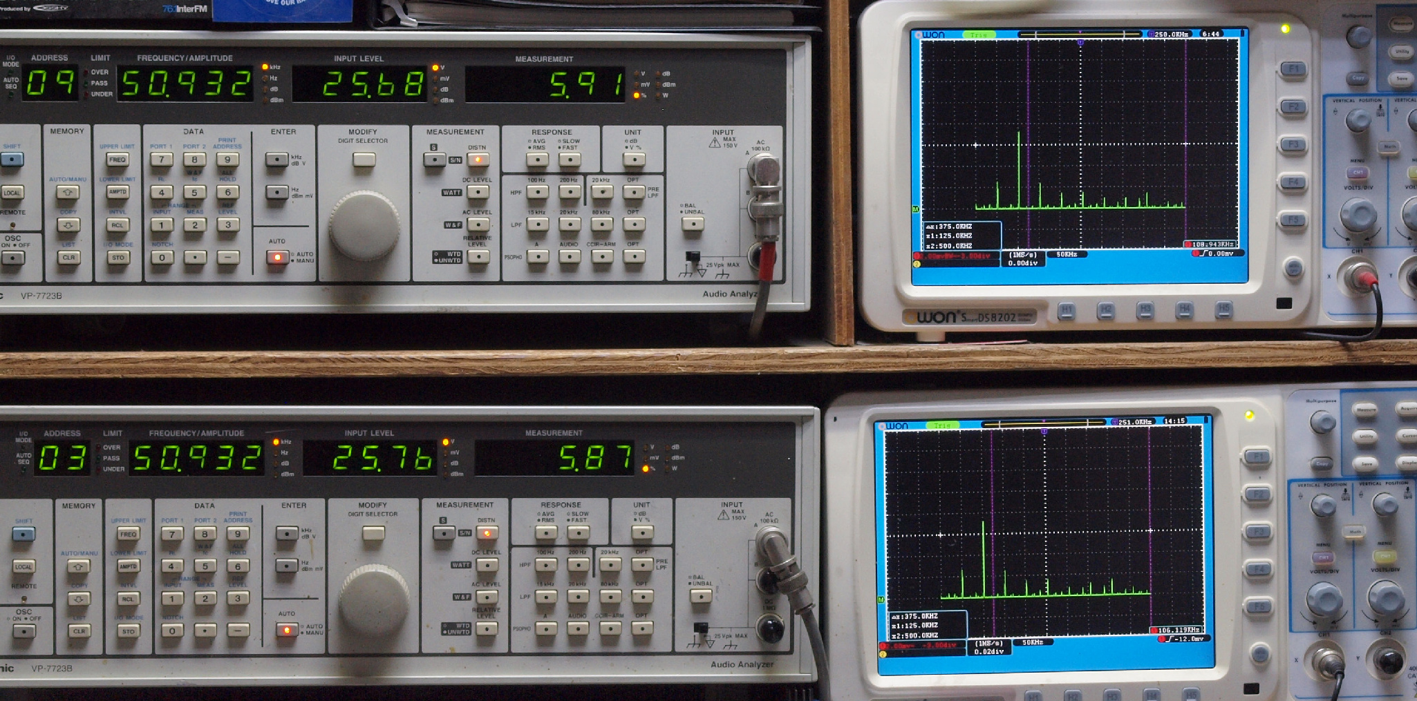 よって、ダイアル設定出力レベルより低くなります。測定機器の仕様や整備の様子はこちら、「VP−7723B」「VP−7201A」。 FFT画面の見方はこちら。
