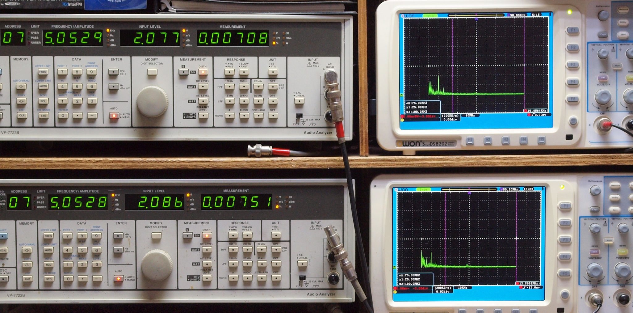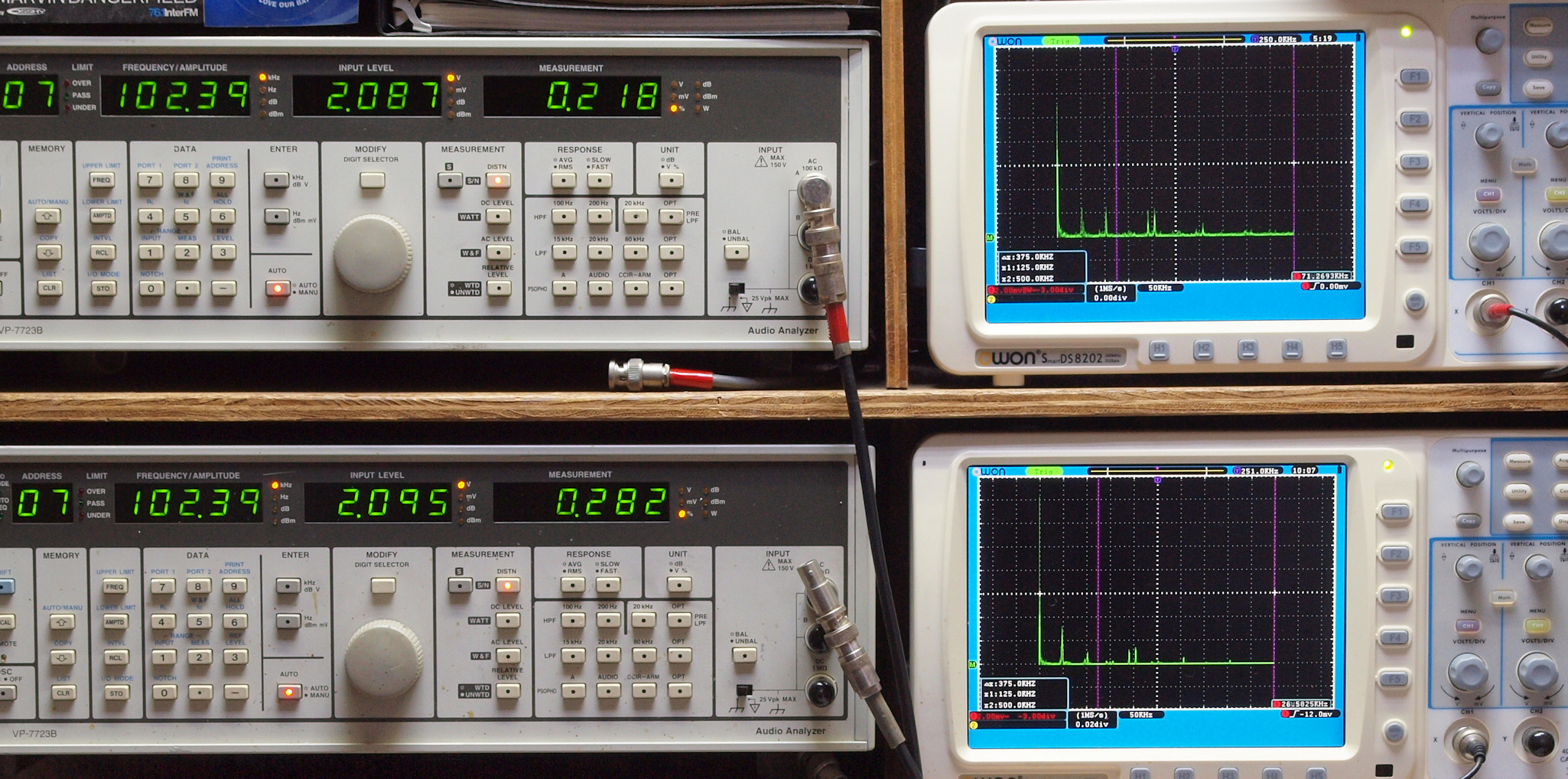 | E. 調整・測定。 画像をクリックすると、大きく(横幅2050ドット)表示されます。 E0. 出力・歪み率測定・調整。 「見方」。 上段中 右側出力を「Audio Analyzer Panasonic VP−7723B」により測定。 表示LED、 左端=メモリーNo、 中左=周波数測定、 中右=出力電圧測定、 右端=歪み率測定。 上段右端 VP−7723Bの基本波除去出力を「owon SDS8202(200MHZ)」で「FFT分析」表示。 下段中 左側出力を「Audio Analyzer Panasonic VP−7723B」により測定。 表示LED、 左端=メモリーNo、 中左=周波数測定、 中右=出力電圧測定、 右端=歪み率測定。 下段右端 VP−7723Bの基本波除去出力を「owon SDS6062(200MHZ)」で「FFT分析」表示。 下段左端 オーディオ発振器 VP−7201A より50Hz〜100kHzの信号を出し(歪み率=約0.003%)、ATT+分配器を通し、AMPに入力。 よって、ダイアル設定出力レベルより低くなります。測定機器の仕様や整備の様子はこちら、「VP−7723B」「VP−7201A」。 FFT画面の見方はこちら。 |
