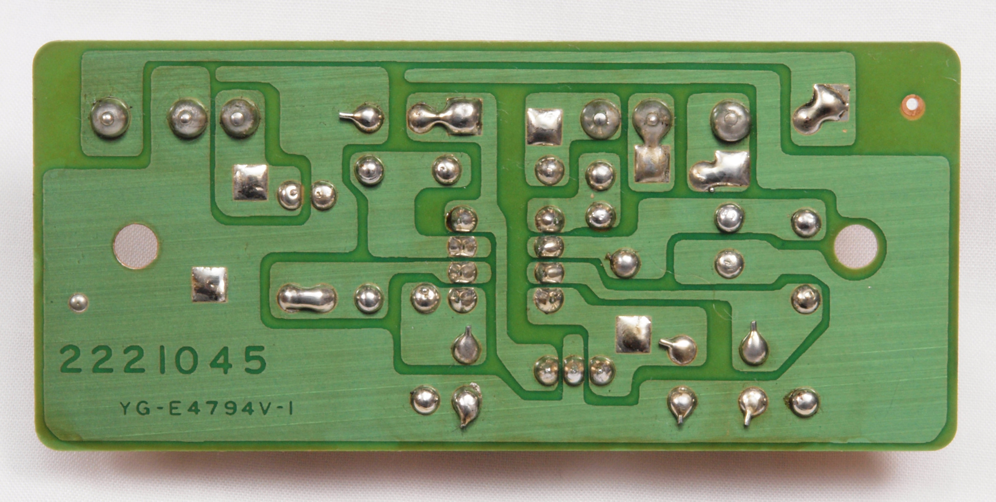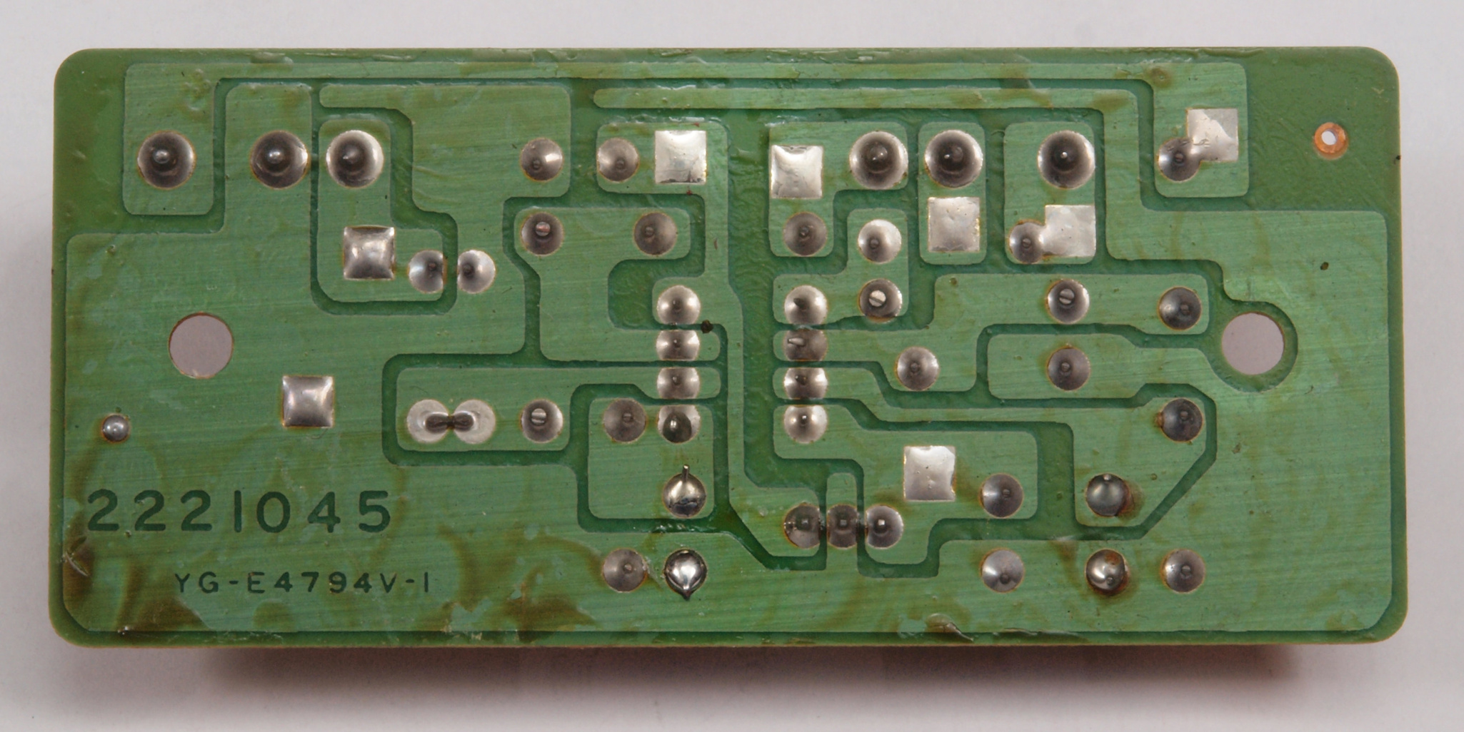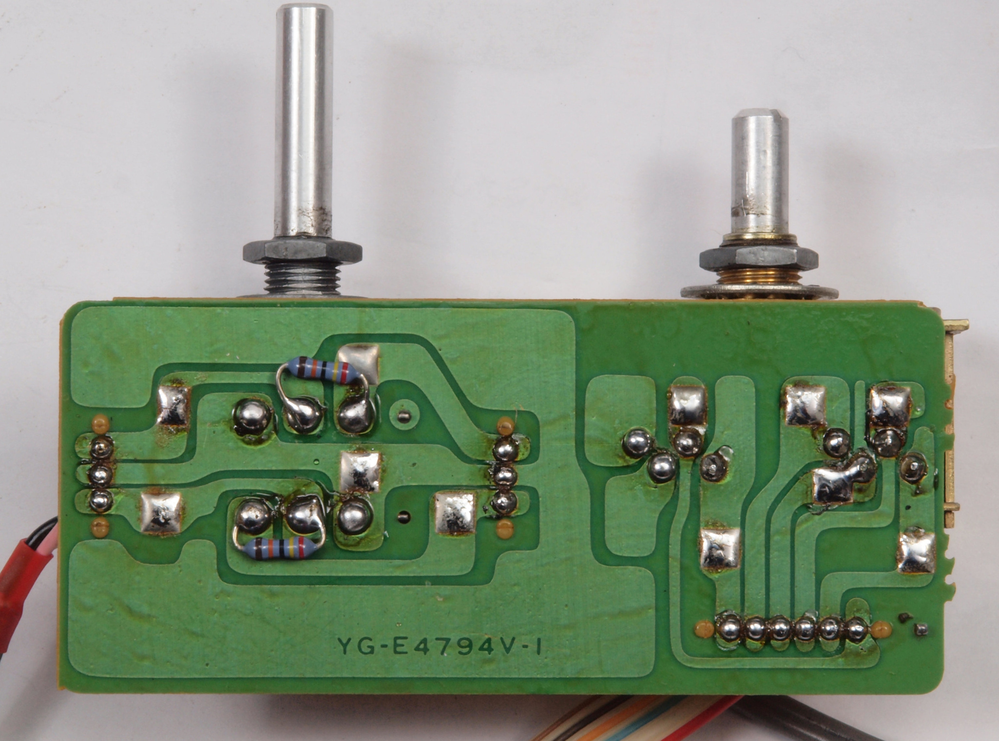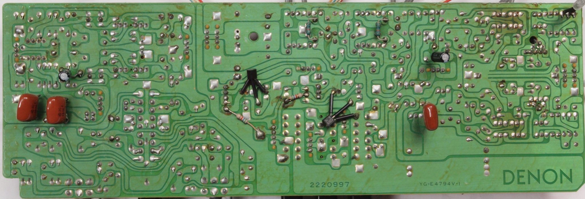 C212. 修理中 EQ−AMP基板。 トルエン溶媒の接着剤。錫メッキジャンパー線が腐食している。