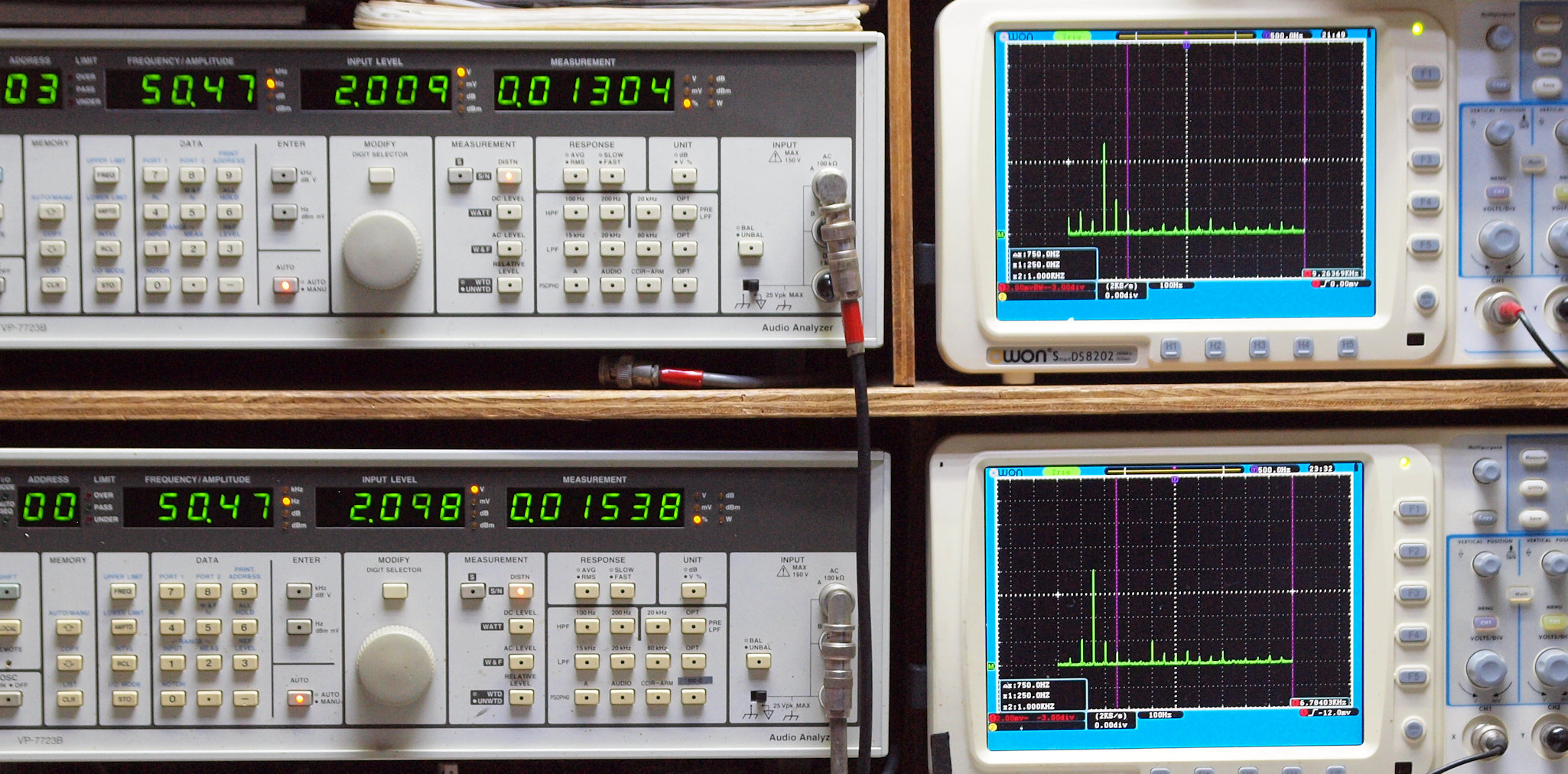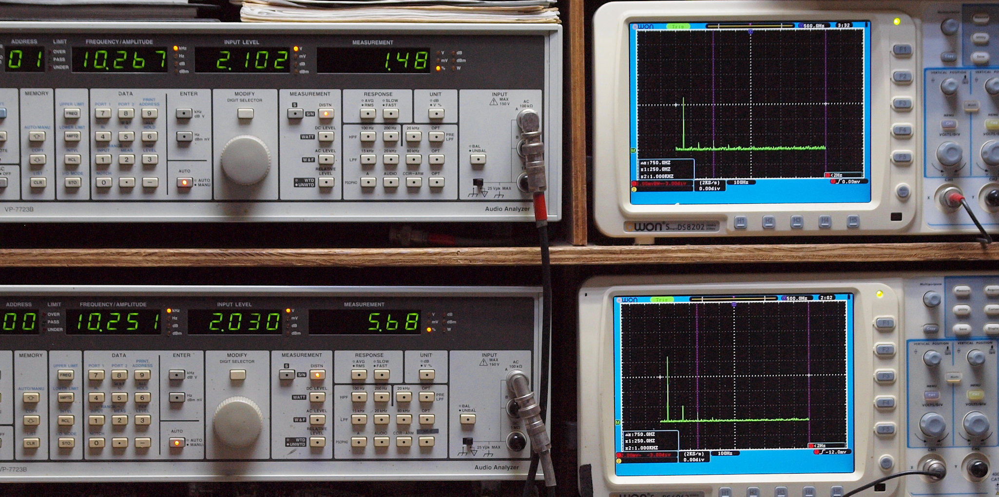 | E. 調整・測定。 画像をクリックすると、大きく(横幅2050ドット)表示されます。 E0. 出力・歪み率測定・調整。 「見方」。 上段中 右側SP出力を「Audio Analyzer Panasonic VP−7723B」により測定。 表示LED、 左端=メモリーNo、 中左=周波数測定、 中右=出力電圧測定、 右端=歪み率測定。 上段右端 VP−7723Bの基本波除去出力を「owon SDS8202(200MHZ)」で「FFT分析」表示。 下段中 左側SP出力を「Audio Analyzer Panasonic VP−7723B」により測定。 表示LED、 左端=メモリーNo、 中左=周波数測定、 中右=出力電圧測定、 右端=歪み率測定。 下段右端 VP−7723Bの基本波除去出力を「owon SDS6062(200MHZ)」で「FFT分析」表示。 下段左端 オーディオ発振器 VP−7201A より50Hz〜100kHzの信号を出し(歪み率=約0.003%)、ATT+分配器を通し、AMPに入力。 よって、ダイアル設定出力レベルより低くなります。測定機器の仕様や整備の様子はこちら、「VP−7723B」「VP−7201A」。 FFT画面の見方はこちら。 |