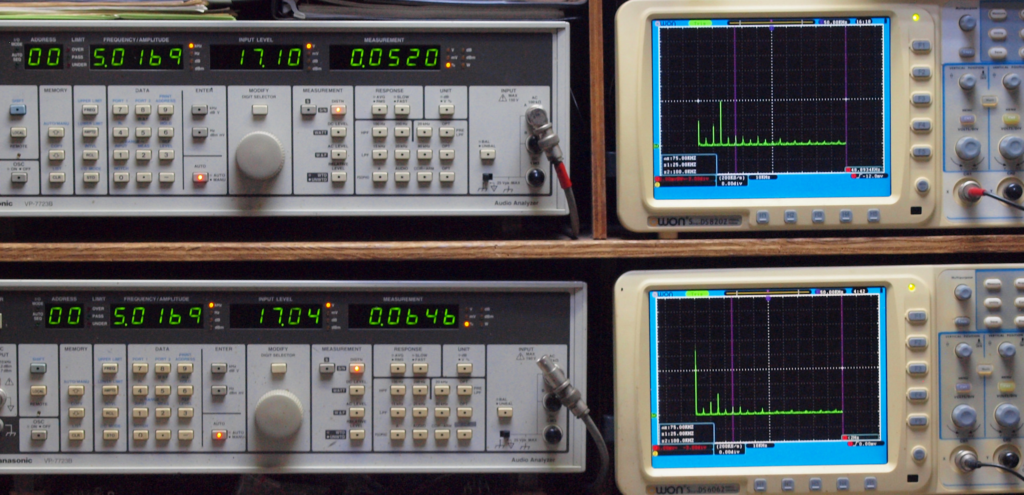 | E. 測定・調整。 画像をクリックすると、大きく(横幅2050ドット)表示されます。 E0. 出力・歪み率測定・調整。 供給電圧はAC100V/50HZ。 「見方」。 上段中 右側SP出力を「Audio Analyzer Panasonic VP−7723B」により測定。 表示LED、 左端=メモリーNo、 中左=周波数測定、 中右=出力電圧測定、 右端=歪み率測定。 上段右端 VP−7723Bの基本波除去出力を「owon SDS8202(200MHZ)」で「FFT分析」表示。 下段中 左側SP出力を「Audio Analyzer Panasonic VP−7723B」により測定。 表示LED、 左端=メモリーNo、 中左=周波数測定、 中右=出力電圧測定、 右端=歪み率測定。 下段右端 VP−7723Bの基本波除去出力を「owon SDS6062(200MHZ)」で「FFT分析」表示。 下段左端 オーディオ発振器 VP−7201A より50Hz〜100kHzの信号を出し(歪み率=約0.003%)、ATT+分配器を通し、AMPに入力。 よって、ダイアル設定出力レベルより低くなります。測定機器の仕様や整備の様子はこちら、「VP−7723B」「VP−7201A」。 FFT画面の見方はこちら。 |