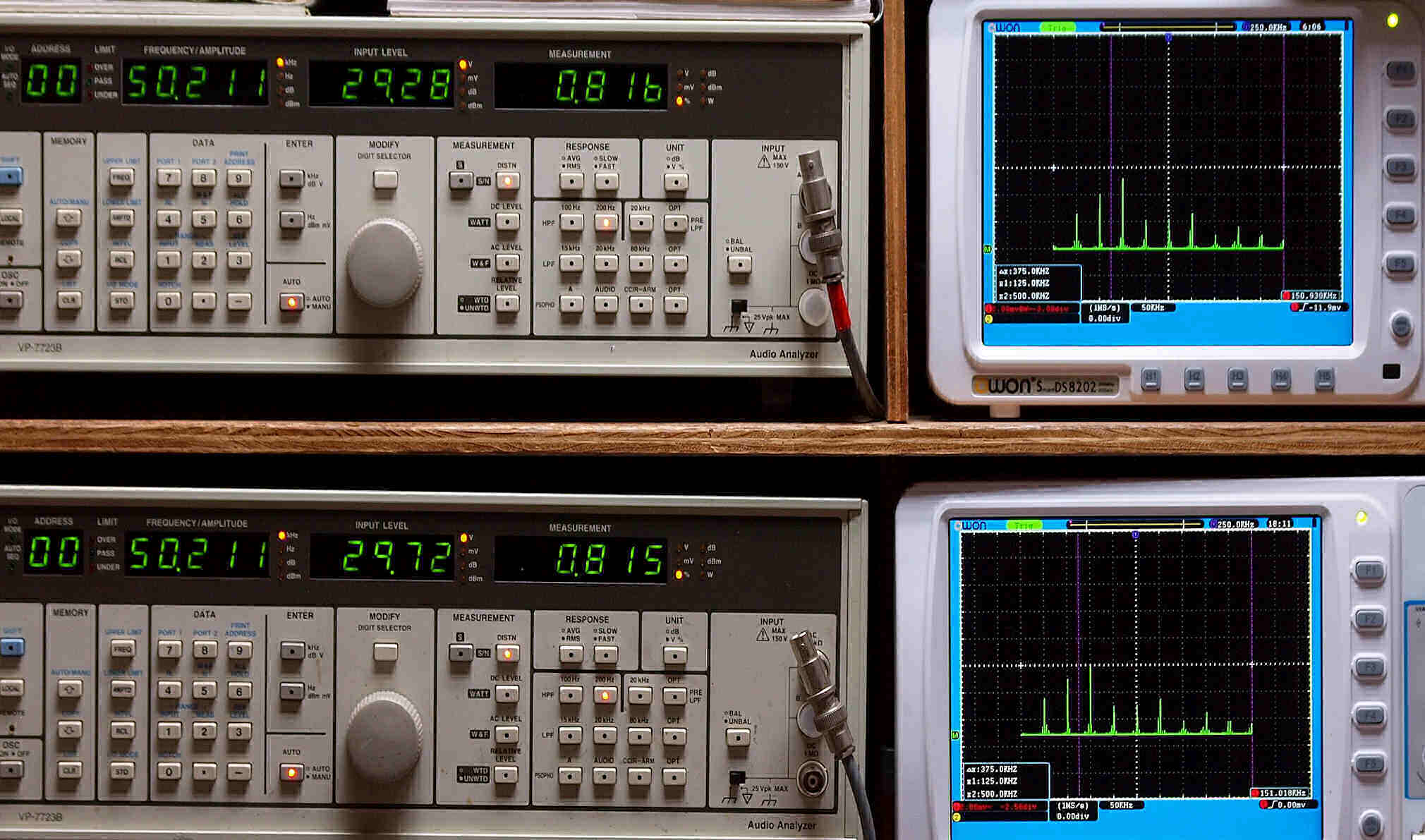 | E. 測定・調整。 画像をクリックすると、大きく(横幅2050ドット)表示されます。 E1. 出力・歪み率測定・調整 「見方」。 上段中 右側SP出力を「Audio Analyzer Panasonic VP−7723B」により測定。 表示LED、 左端=メモリーNo、 中左=周波数測定、 中右=出力電圧測定、 右端=歪み率測定。 上段右端 VP−7723Bの基本波除去出力を「owon SDS8202(200MHZ)」で「FFT分析」表示。 下段中 左側SP出力を「Audio Analyzer Panasonic VP−7723B」により測定。 表示LED、 左端=メモリーNo、 中左=周波数測定、 中右=出力電圧測定、 右端=歪み率測定。 下段右端 VP−7723Bの基本波除去出力を「owon SDS6062(200MHZ)」で「FFT分析」表示。 下段左端 オーディオ発振器 VP−7201A より50Hz〜100kHzの信号を出し(歪み率=約0.003%)、ATT+分配器を通し、AMPに入力。 よって、ダイアル設定出力レベルより低くなります。測定機器の仕様や整備の様子はこちら、「VP−7723B」「VP−7201A」。 FFT画面の見方はこちら。 |
