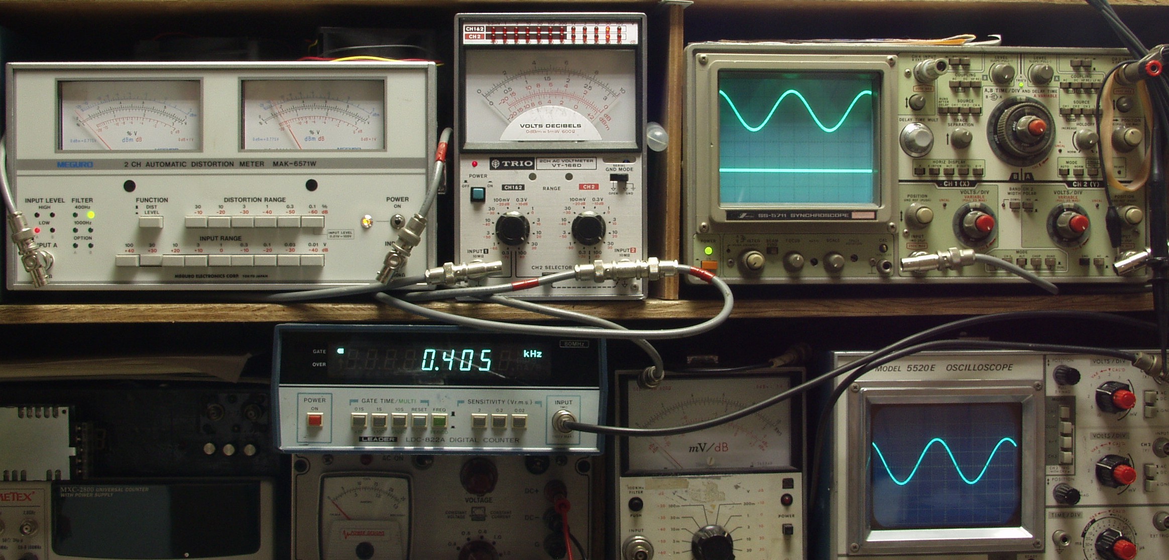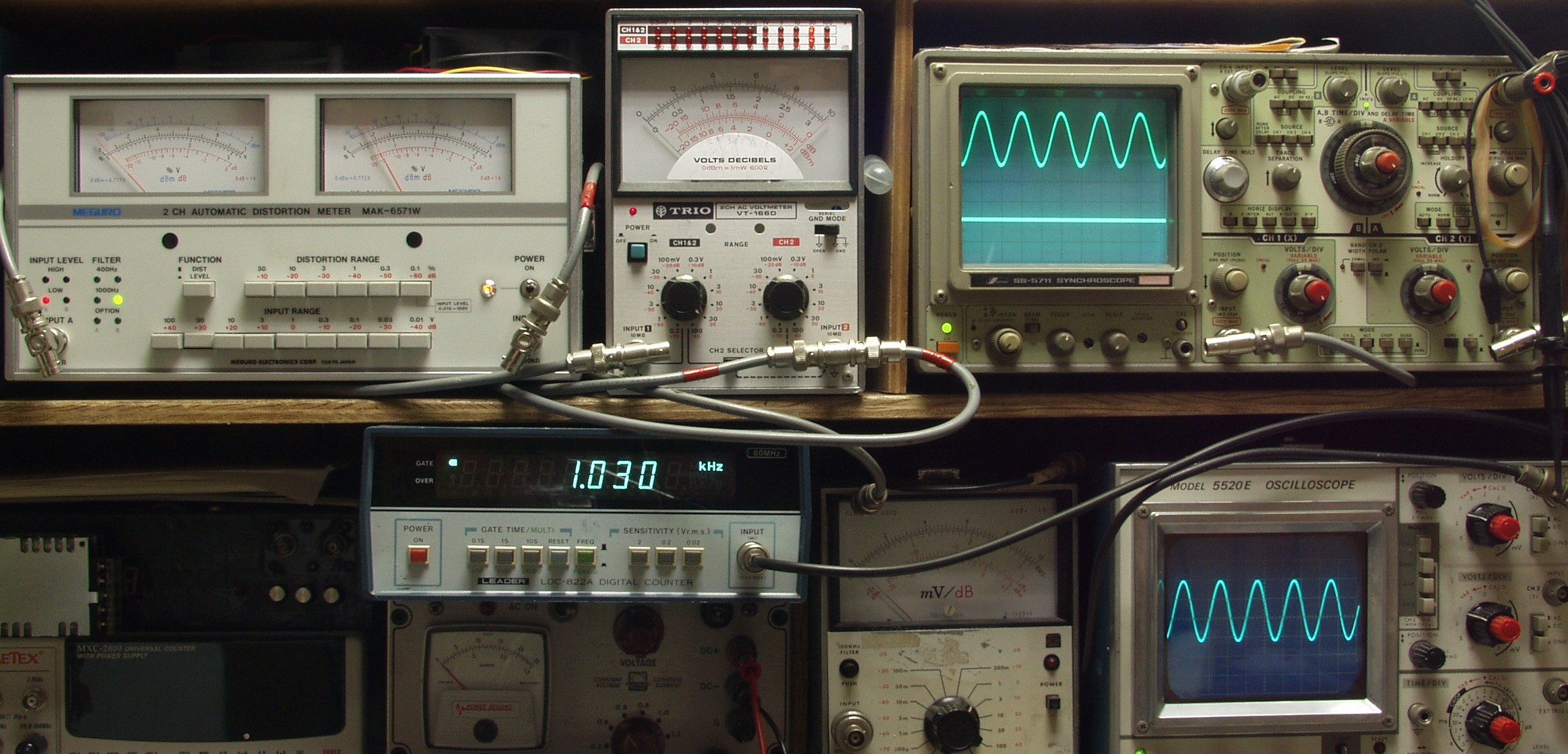 | E. 調整・測定 E1. 出力/歪み率測定・調整 <見方> 下左オーディオ発振器より400HZ・1KHZの信号を出す(歪み率=約0.003%) 下中=入力波形(オーディオ発振器のTTLレベル) 下右=周波数計 上左=SP出力の歪み率測定 左メータ=L出力、右メータ=R出力 上中=SP出力電圧測定器、赤針=R出力、黒針=L出力 上右=SP出力波形オシロ 上=R出力、下=L出力(出力電圧測定器の出力) |