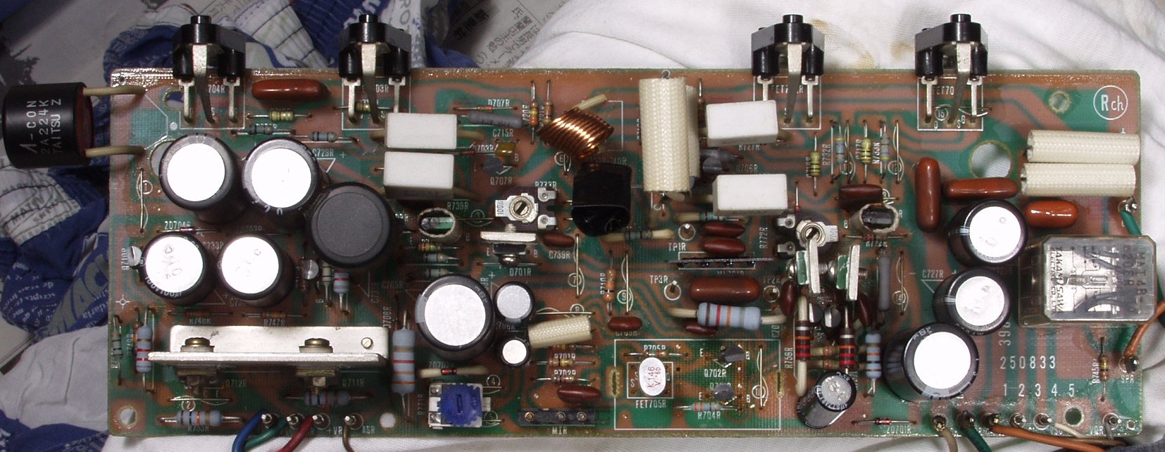 | C5D. 修理(半田補正)後 RCA端子 裏 半田を全部やり直す フイルムコンデンサー2個交換、2個増設 |