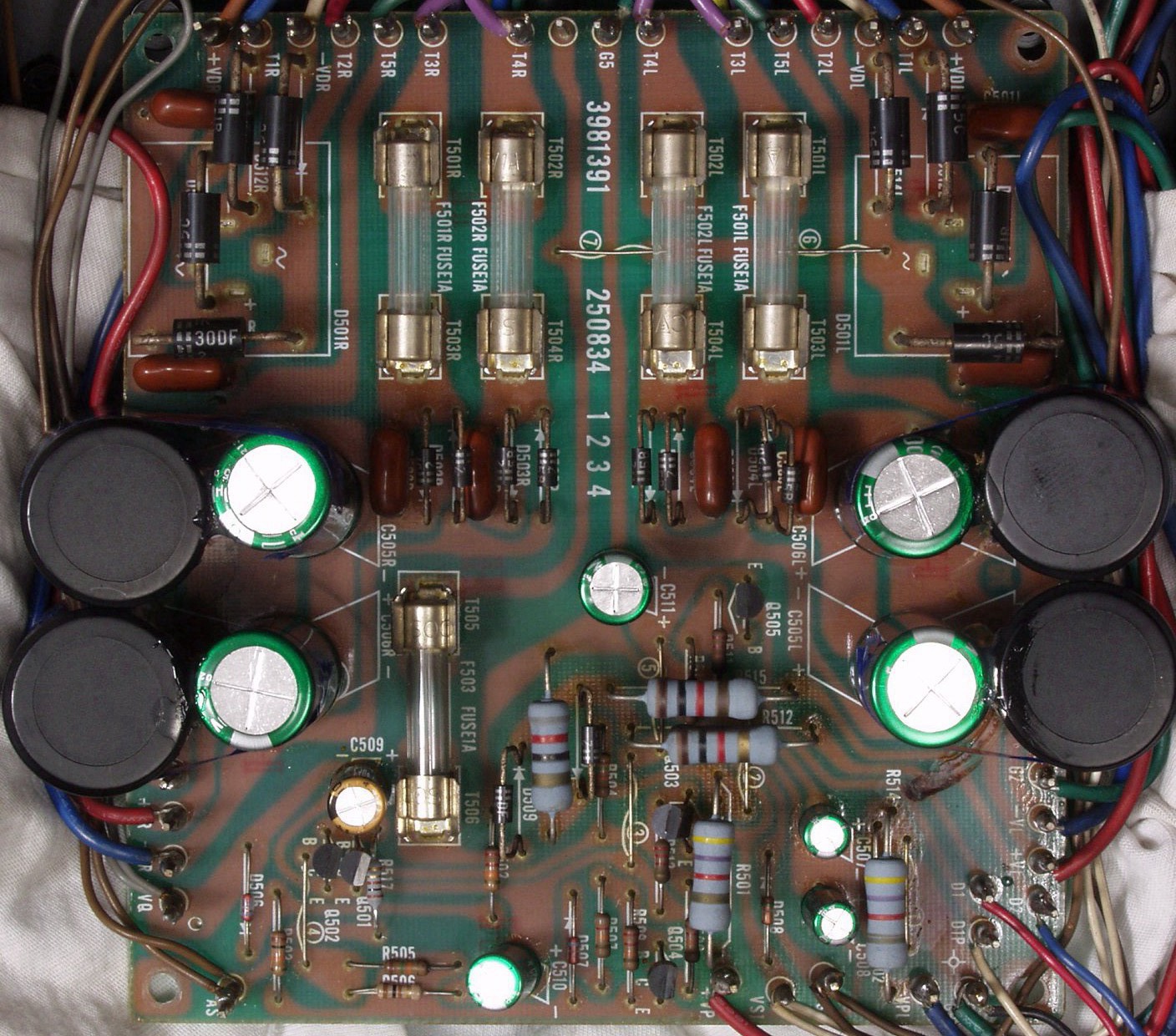 | A. 修理前の状況 A1. 修理前点検中 下から見る、非常に綺麗です AMP部の電解コンデンサーのビニールの後退は左が多い |
