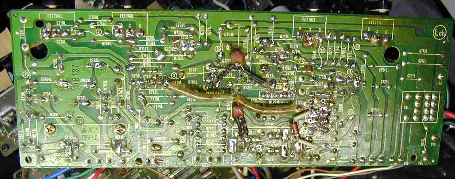 | 4. L側、ドライブ基板裏、何回も部品を取り替えたらしく、銅箔がかなりの数、剥離している。 部品を取るには、半田吸い取り器、又は、ハンダ吸い取り線を使用すること。 |