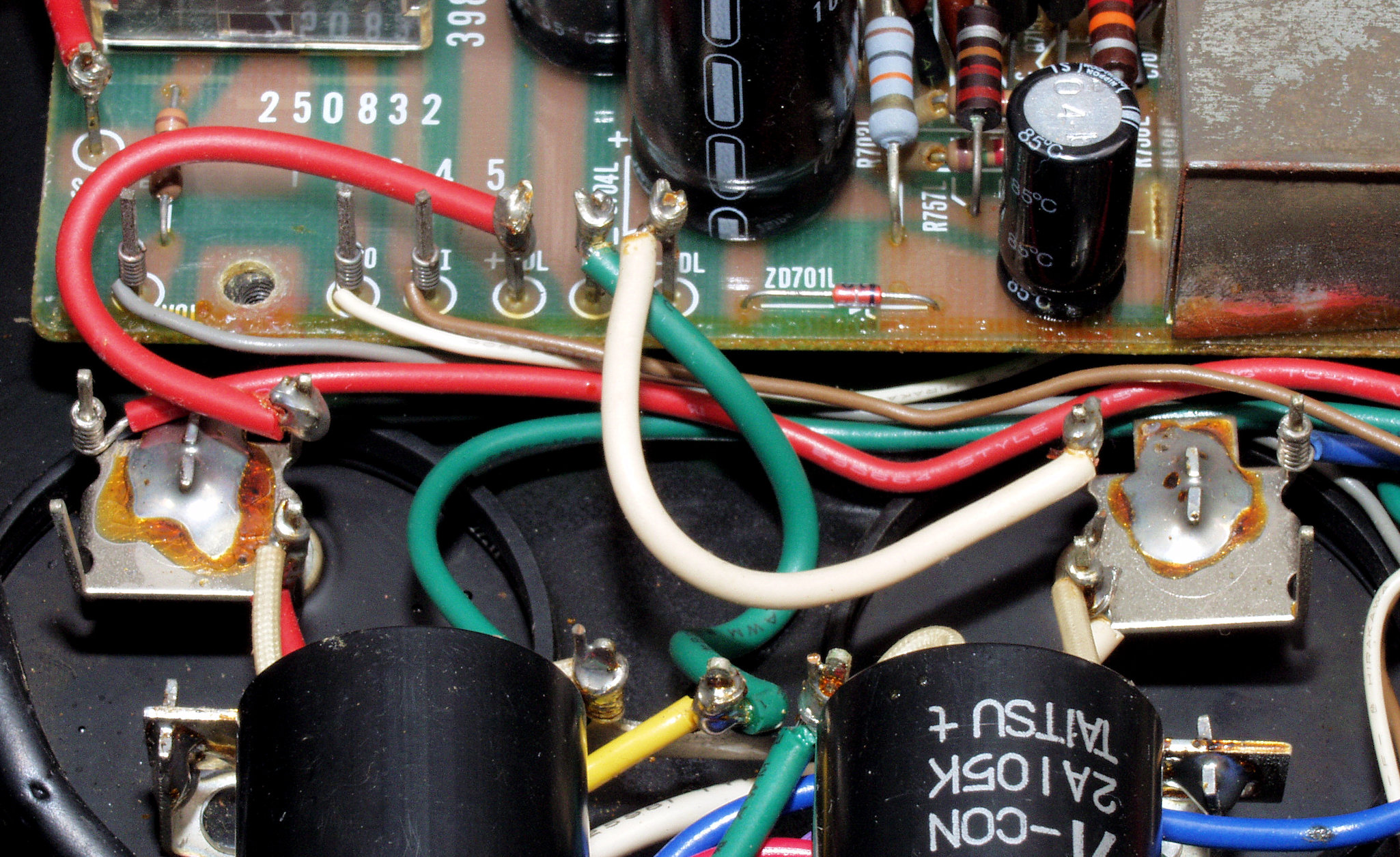 | C212. 修理前 R側ドライブ基板、拡大。 フューズ抵抗がカーボン抵抗に置き換えられている、バイアス調整VRは機械的センター。 |