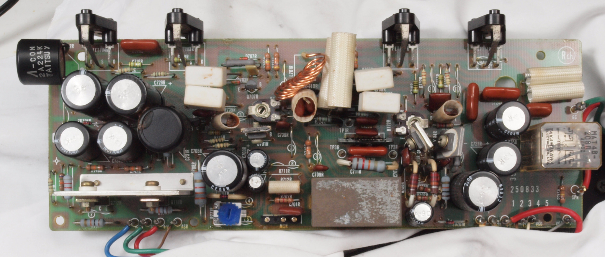 C43. 修理中 RLモジュール裏。 TR(トランジスター)6個交換し、洗浄後軽くラッカーを吹く。