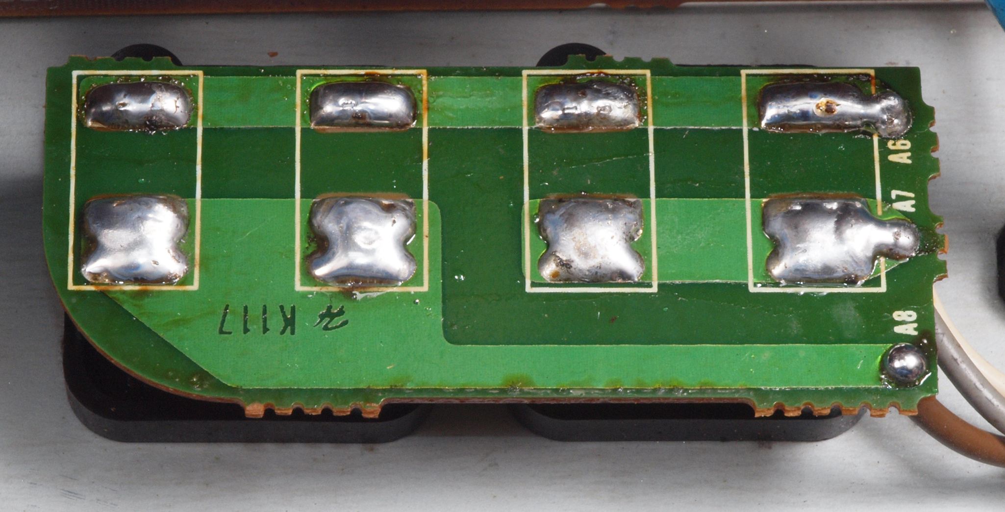 C62. 修理(半田補正)後 TAPE−SW基板裏、  全ての半田をやり修す。