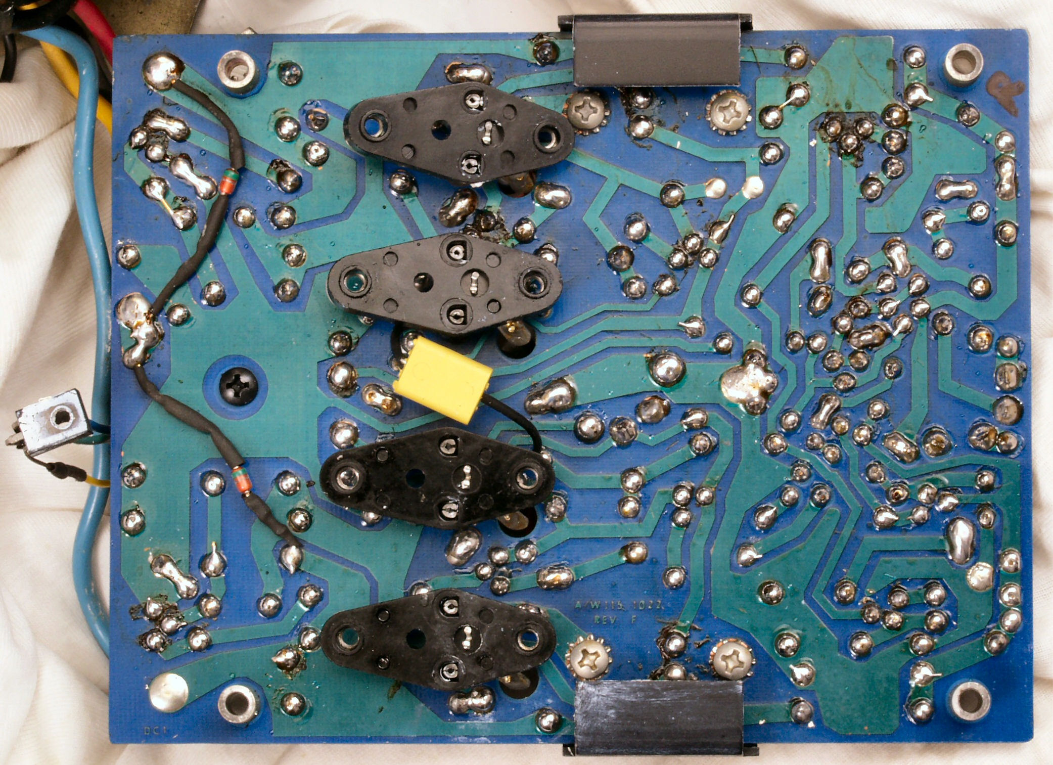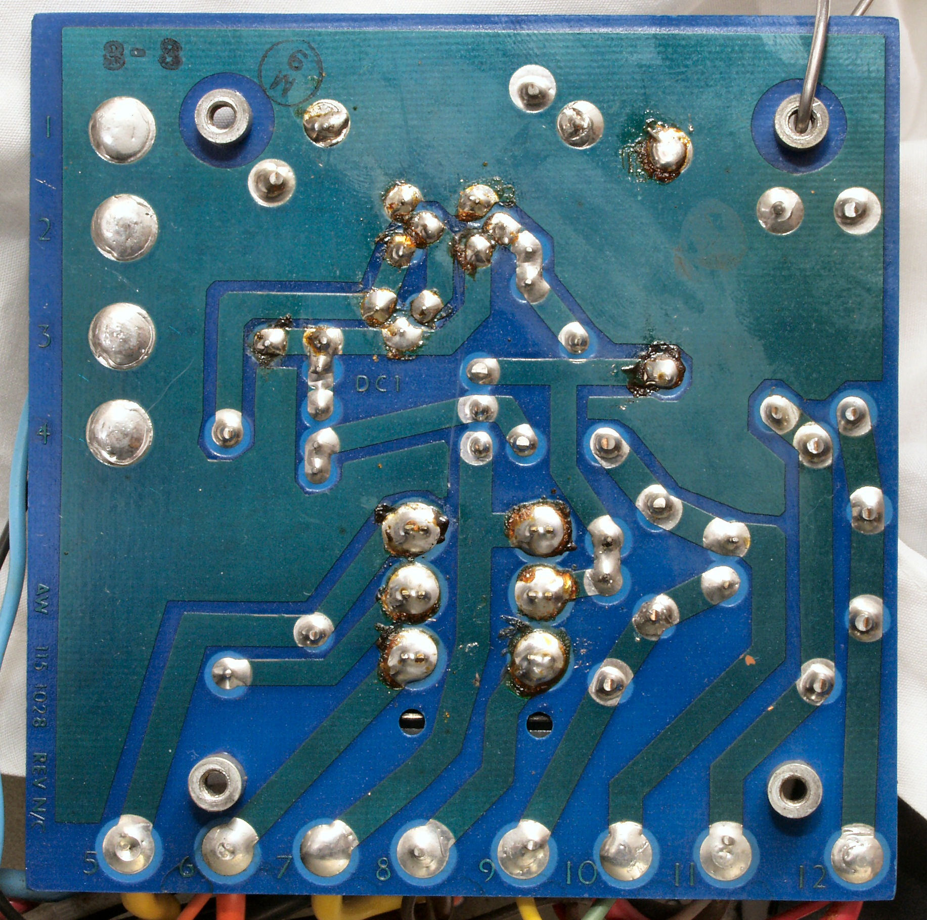 | C−4D. 修理(半田補正)後 VU基板裏,、腐食した銅箔はメッキ線で補修する。 | ||||||||||||||||||||||||||||||