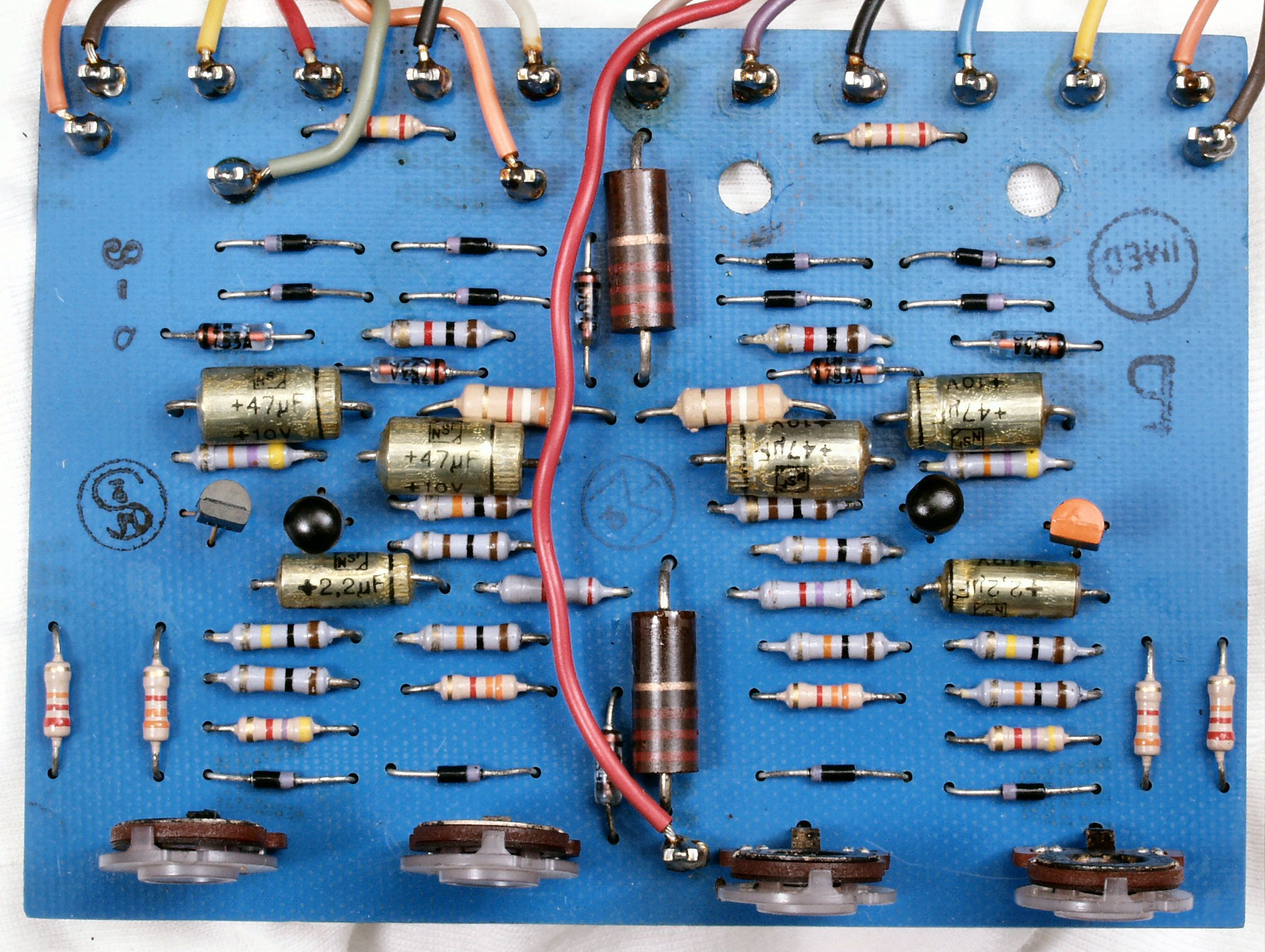 | C−2D. 修理後 L側AMP基板 TR(トランジスター)3個、電解コンンサー4個、半固定VR2個、フイルムコンデンンサー2個交換 | ||||||||||||||||||||||||||||||