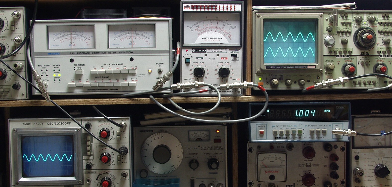 | E. 調整・測定 E1. 出力/歪み率測定・調整 <見方> 上左オーディオ発振器より400HZ・1KHZの信号を出す(歪み率=約0.003%) 下中=入力波形(オーディオ発振器のTTLレベル) 下右=周波数計 上左=SP出力の歪み率測定 左メ−タ−=L出力、右メ−タ−=R出力 上中=SP出力電圧測定器、赤針=R出力、黒針=L出力 上右=SP出力波形オシロ 上=R出力、下=L出力(出力電圧測定器の出力) |