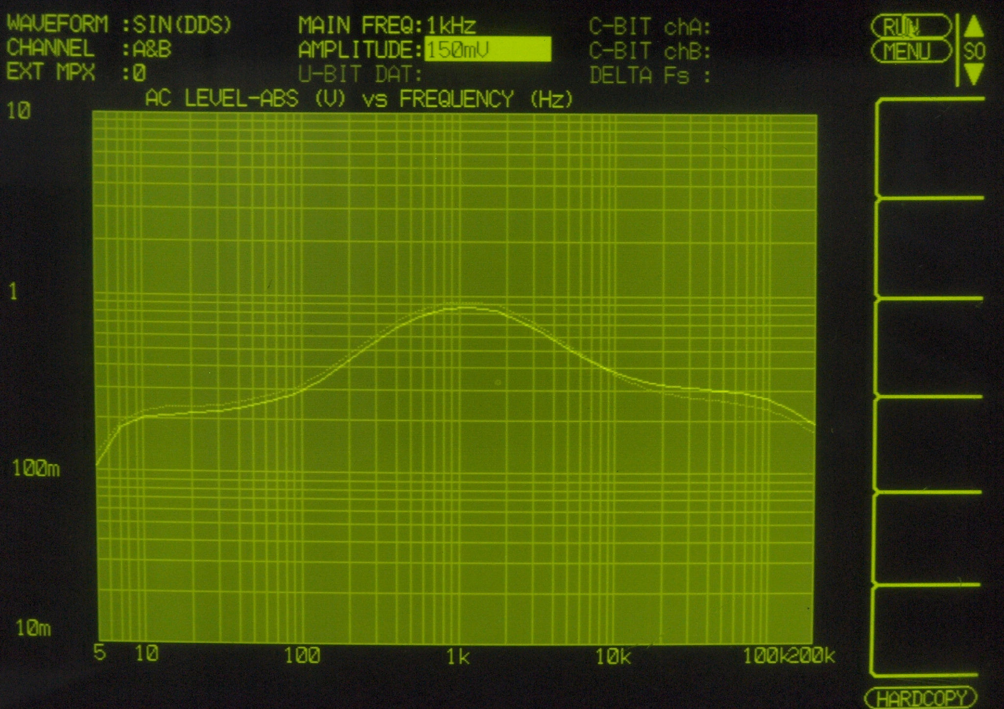 | F16. 入出力特性測定(AUX入力) BASS=500Hz & TREBLE=2.5kHz 最小 AUX入力端子へ150mV一定入力 VRはmax。 平均で1V出力 左出力=薄(細い)色 右出力=濃い(太い)色 |