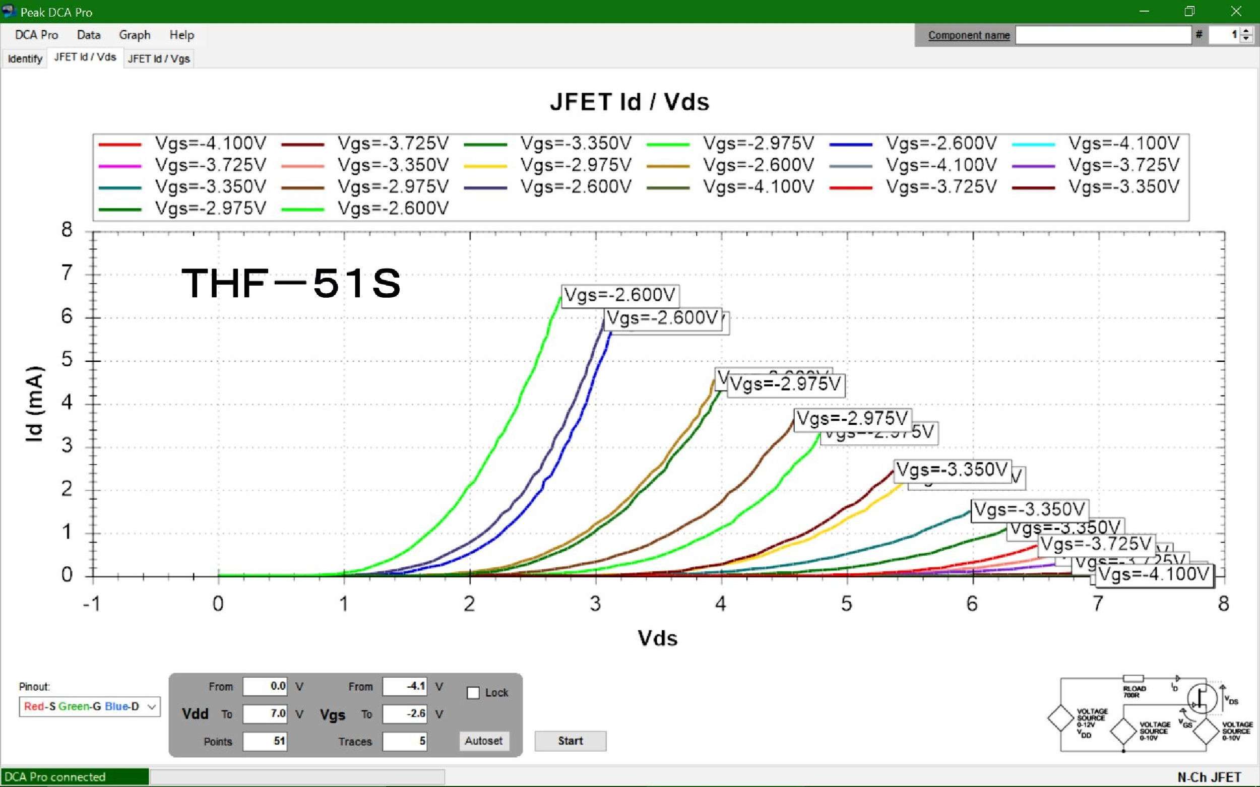 A64. THF51s測定。赤い数字=Vp電圧(Vds=80V)、Kい数字=Id(Vds=15V、Vgs=−2V)。