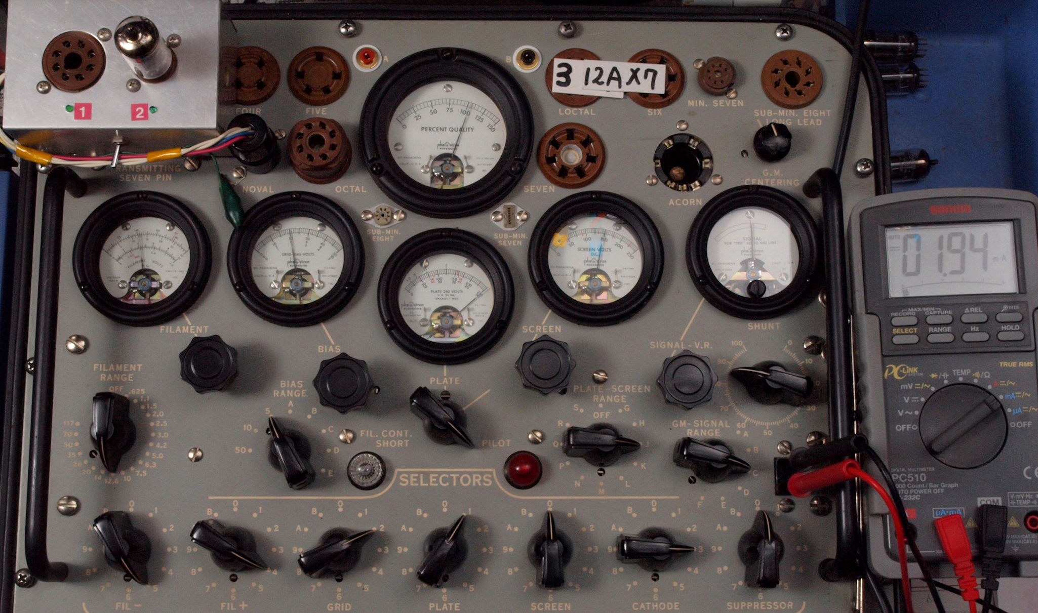 | U31. 付属3本目「12AX7」ユニット1。 Gm測定=2060μmho、IP=1.94mA。 測定条件、「Ep=250V、Eg1=−2V」。 RangeSW=C、FullScale=3000μmho |