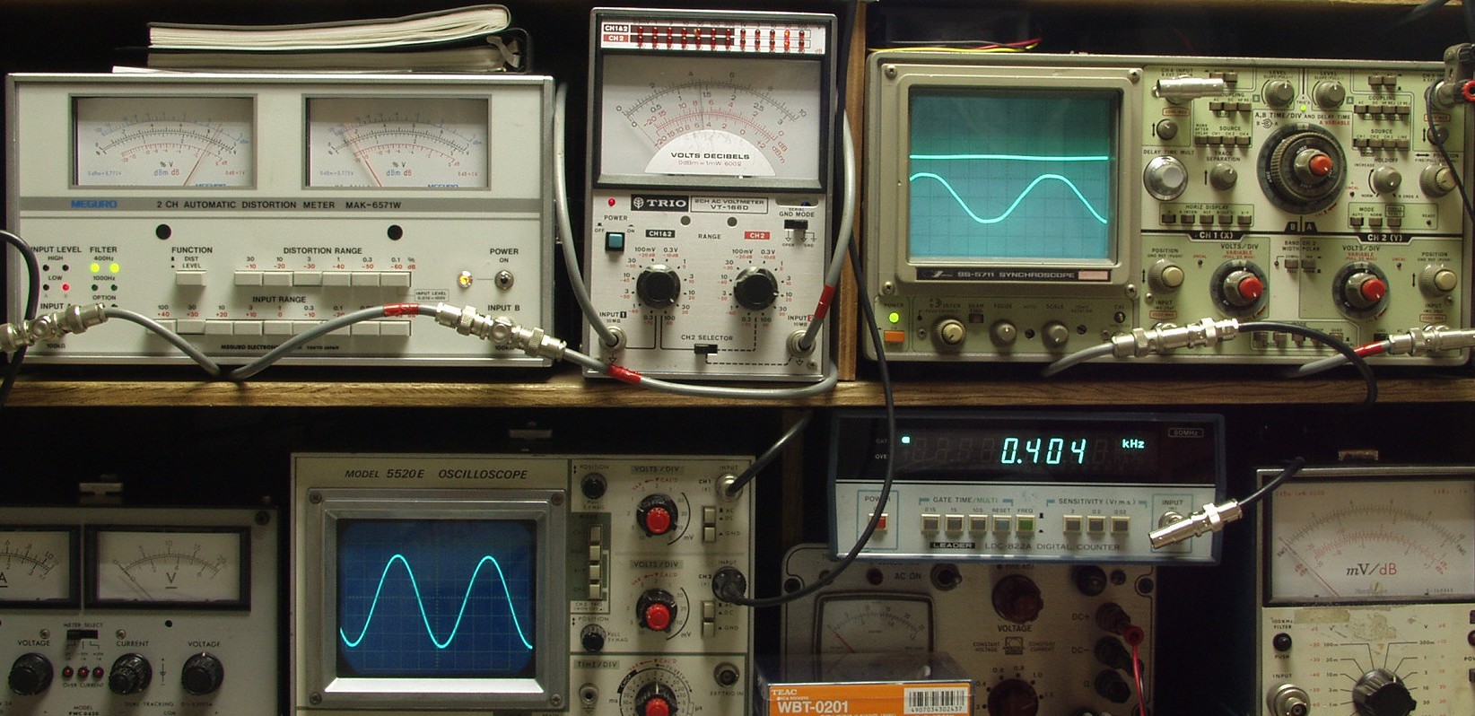 | E. 調整・測定 E1. 修理後 出力・歪み測定 <見方> 上左オーデオ発振器より400HZ・1KHZの信号を出す(歪み率=約0.003%) 下中=入力波形(オーディオ発振器のTTLレベル) 下右=周波数計 上左=SP出力の歪み率測定 左メータ=L出力、右メータ=R出力 上中=SP出力電圧測定器、赤針=R出力、黒針=L出力 上右=SP出力波形オシロ 上=R出力、下=L出力(出力電圧測定器の出力) |