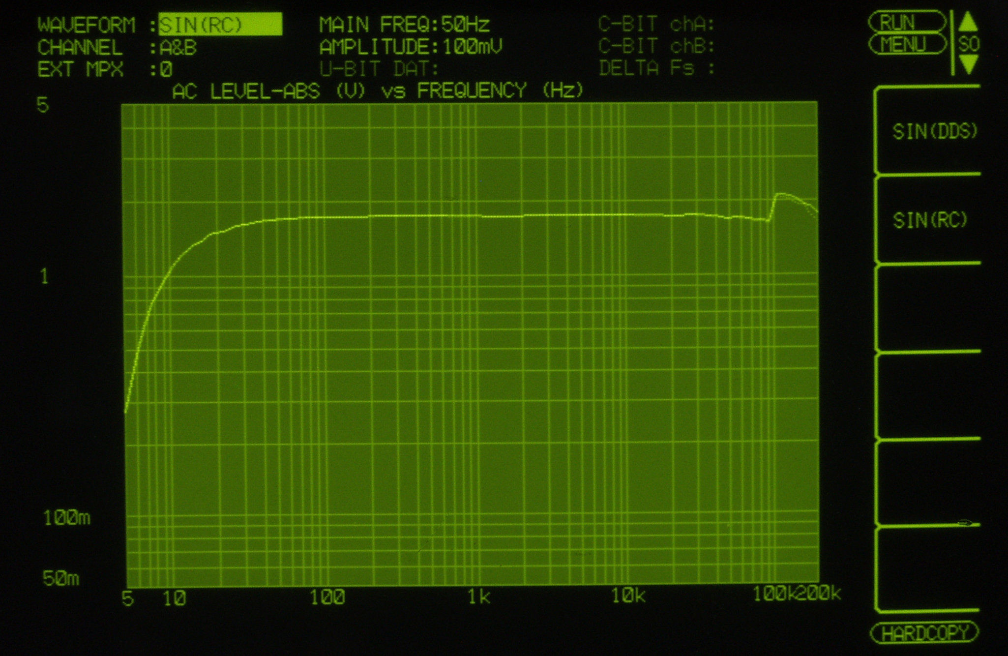 | E42. 出力電圧5V 歪み率=0.9%(測定レンジ=1%) AUX入力 400HZ。 右側は真空管が元気なので、この直ぐ上で飽和する。 | ||||||||||||||||||||||||||||