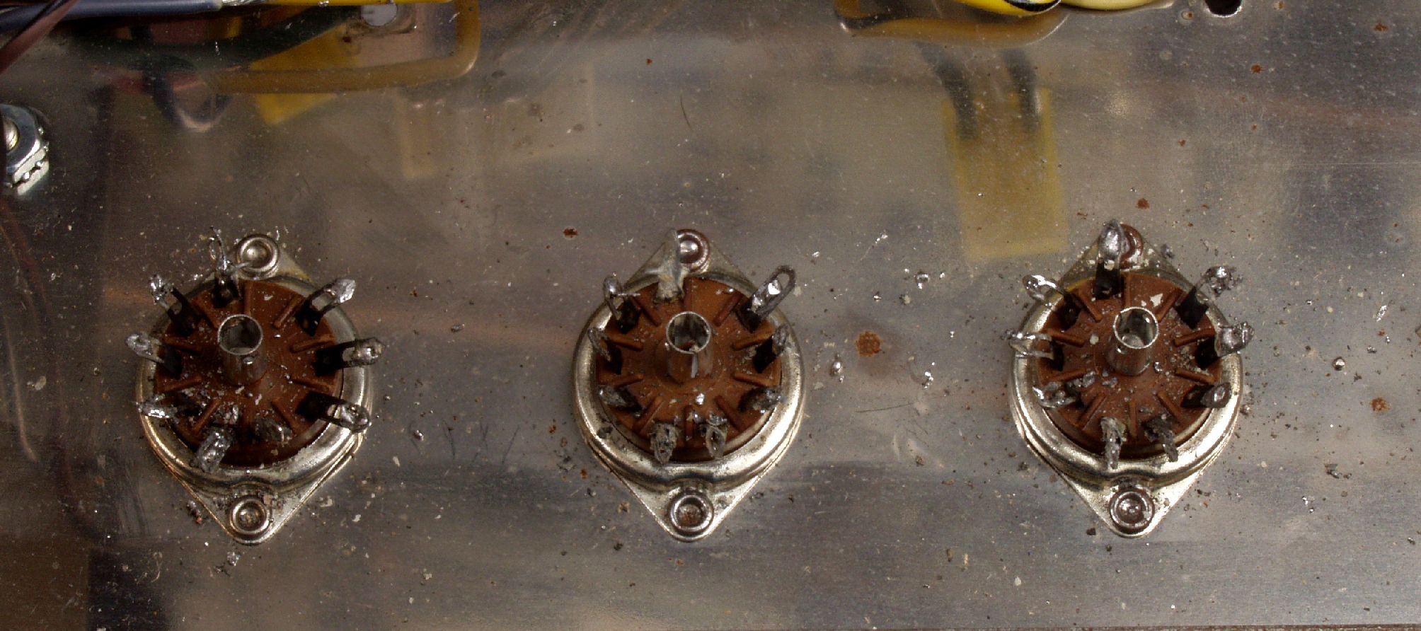 A5B. 点検中 V1・V2ソケットの半田、腐食がかなり進んでいる。ここまで進むと半田補正は不可で、接続をやり直す。