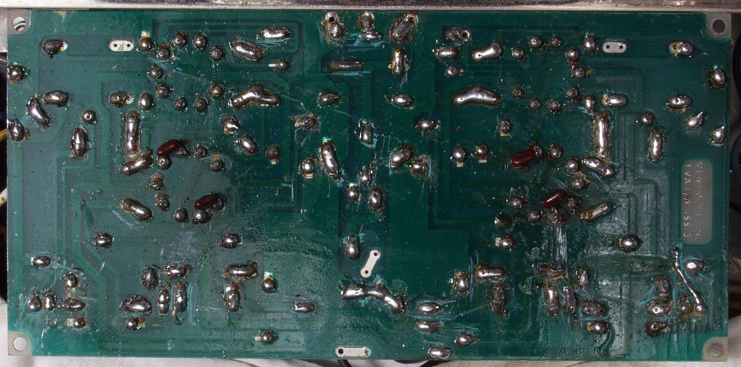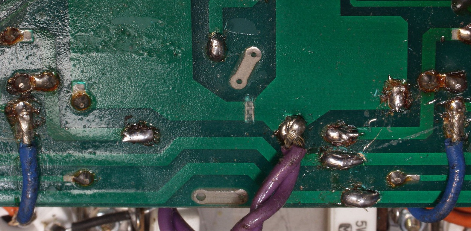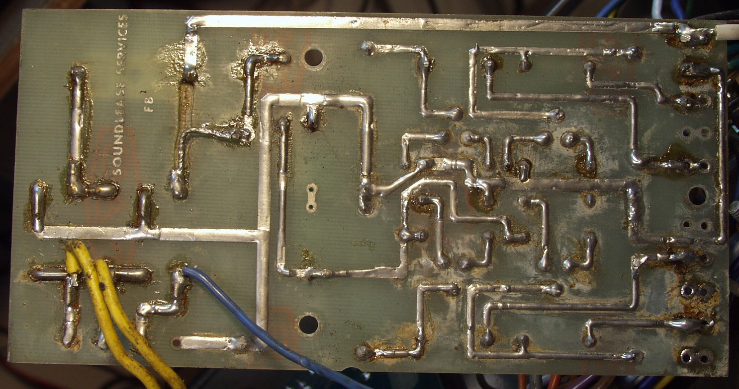 C13. 修理前 前段AMP基板裏 手抜きで引き出し線がみな銅箔に半田付け これでは銅箔が直ぐに剥離する