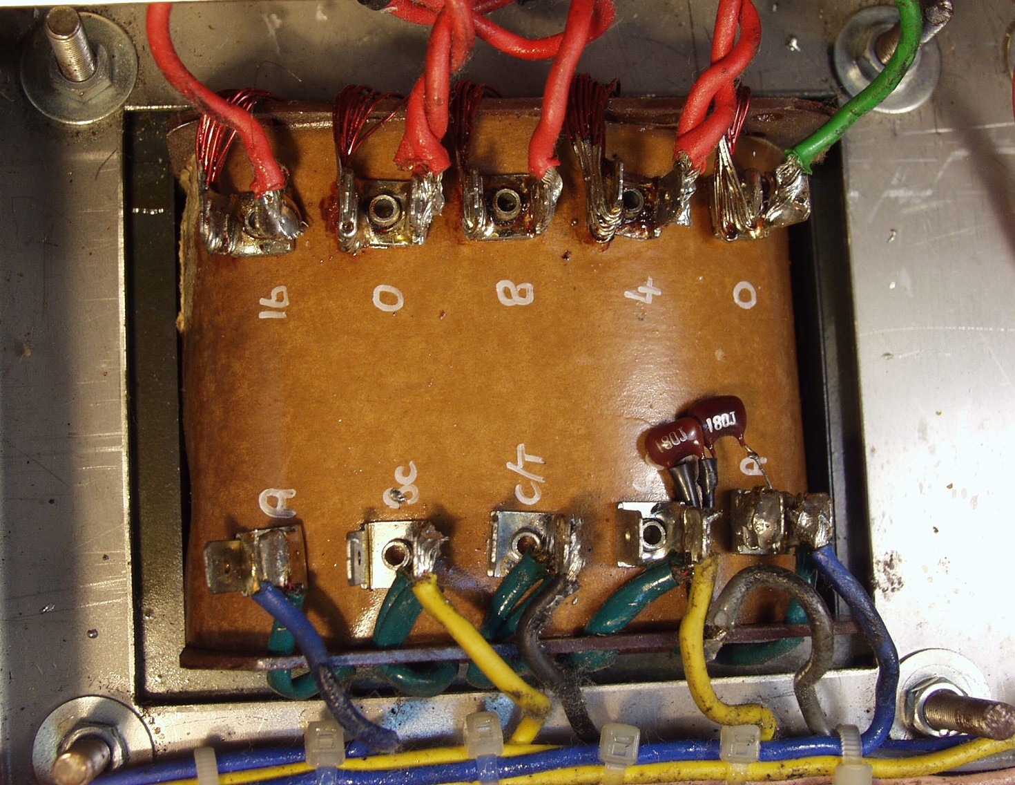 A12. 修理前の点検、 下から見る カソード抵抗が2本交換して有る。 又、ヒータートランスが増設してある。